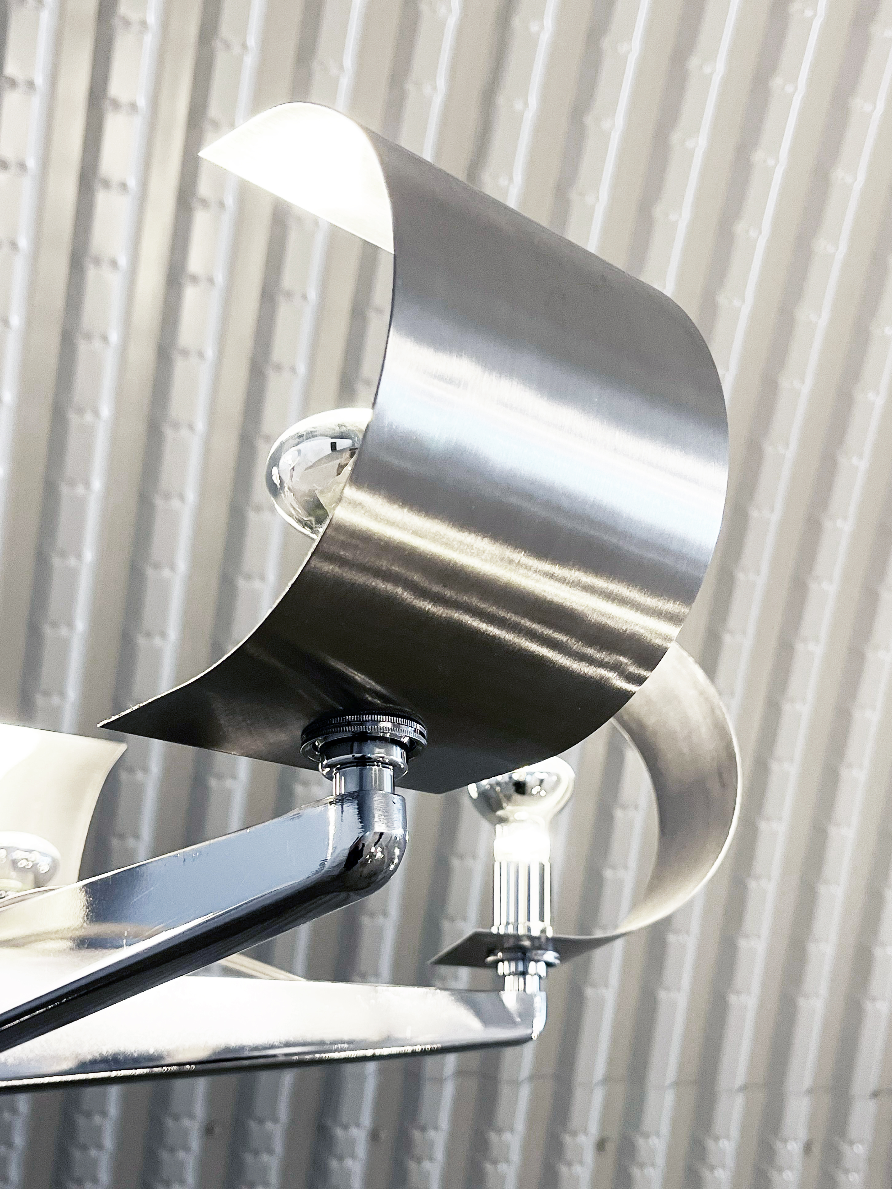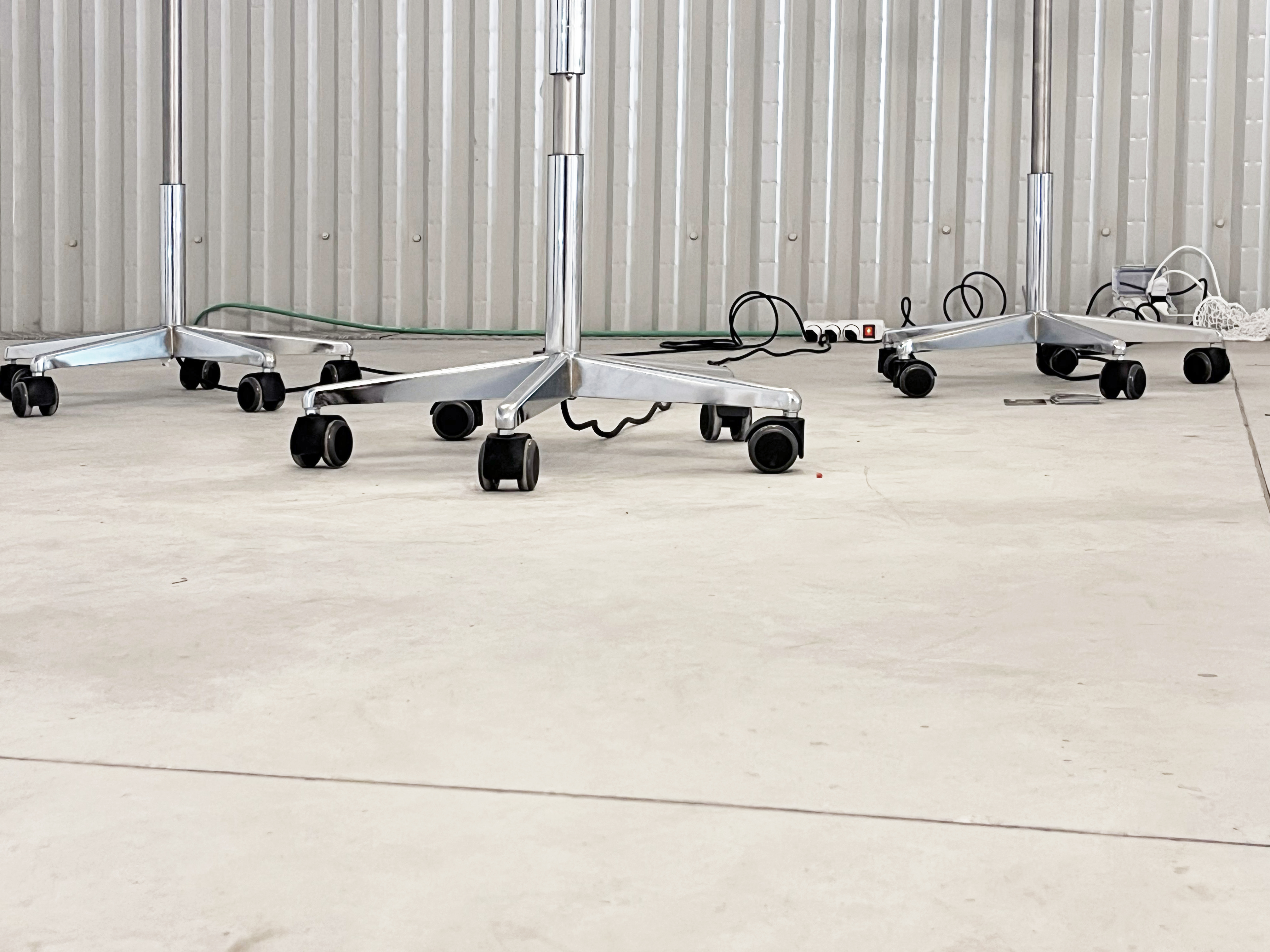The five-legged chrome frame of the office chair is dismantled and joined with a second identical frame by using a steel tube. The hollow arms of the structure provide a seamless path for electrical wiring, guiding it through the tubular steel frame. Once-used caster sockets are now repurposed as fittings for five radiant LED lights, illuminating the upper part of the lamp. Meanwhile, the remaining wheels at the base preserve it‘s mobility, allowing the light to glide effortlessly through space—an object in motion.